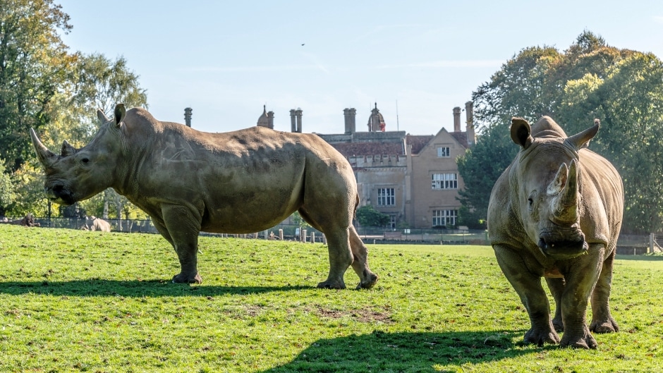 Our rhinos have access to a specially designed house, adjacent landscaped hardstanding area with water hole and a large paddock shared with scimitar-horned oryx and Grevy’s zebra. The environment has all the resources rhinos naturally use, including plenty of year-round grazing, sandy areas for resting and rolling, mud wallow, and shade trees along with rocks and tree trunks for rubbing against. They are subject to 24-hour security surveillance.